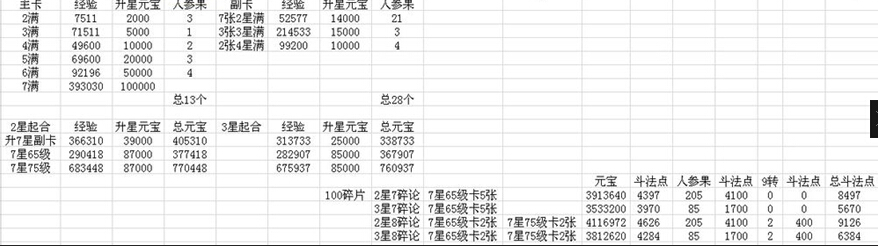 (1)主卡部分比较简单,就是分别把对应星的卡从初始等级到升满需要花的经验,以及再次升星需要花费的元宝。