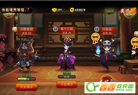要增加新的伙伴就必须到招贤馆里面进行招募,《囧西游》以囧为名,其招募方式当然要很囧,通过博弈的方式(其实就是摇骰子)来得到伙伴的好感度。高品质的伙伴需要玩家达到对应的境界才能开启,这样就能使免费玩家与RMB玩家能够站在同一条起跑线上。而且摇骰子完全是要看运气,运气好就能将好感度一直飙升上去。虽然概率是百分之五十,但如果玩家摇出3个数字一样的就算是豹子,所以玩家获胜的概率肯定会比电脑的概率大。值得注意的是,越高品质的伙伴博弈所需的铜钱就要越多。所以要招募到一个好伙伴就得先看看你是否有足够的铜钱喔!