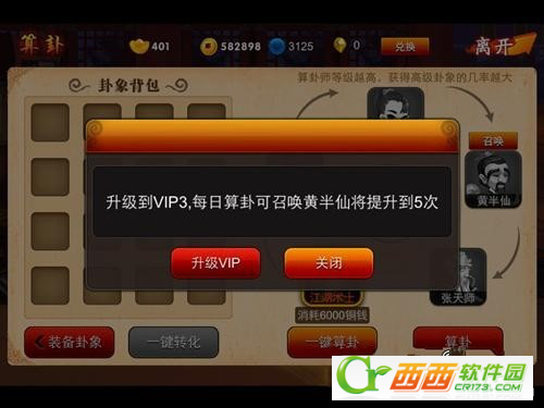 所以VIP3的高级卦象也是会提高的哦!在你操作步骤二同时,系统会很有良心的判定你要成为VIP,然后你之后的操作都会让你出现越高级的算卦师。也许你们会认为这是BUG,其实不然,这只是免费玩家省钱方式,卦象作为运气成分较高的玩法,就算你一直点出黄半仙、张天师,如果运气不好,还是只能获得卦象碎片而已。