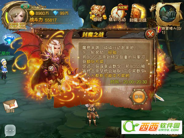 除去固定奖励外,根据我们队BOSS造成的伤害还有得到奖励加成,在BOSS到达一定血量时击杀会得到幸运击杀的奖励,伤害排行榜前3名的玩家还会获得活动大奖。最重要的是,每个参与活动的玩家还可以获得3个幸运数。系统将随机产生一个中奖号码,如果与你手中的幸运数相同的话,你将获得意想不到的大惊喜!