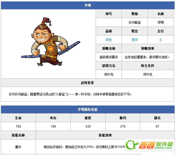 《全民水浒》中拥有数量众多的武将,而质量自然也是参差不齐。对于免费玩家来说,要想获得一个好的武将自然不会那么容易,那么究竟哪些武将比较适合平民玩家呢?这里西西就来给大家推荐一个不错的武将——李明。