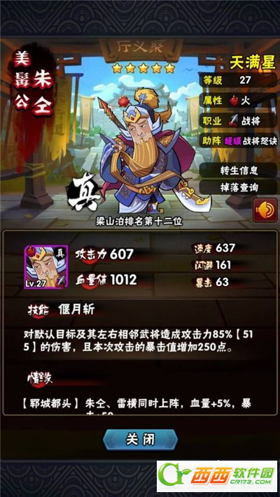 朱仝的技能是个AOE技能,还带暴击值加成,在没有关胜的情况下用他还是不错的。