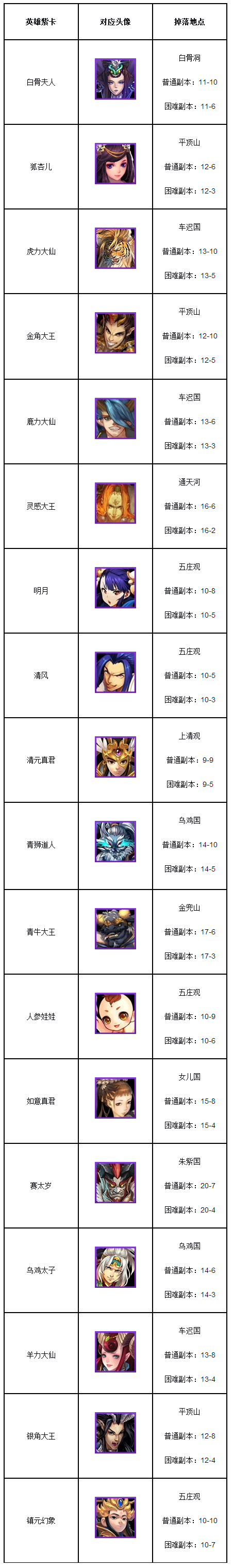 在《欢乐西游》中,紫卡不仅是队伍中的主力,而且是主角卡升级+1所需要的材料,因此刷紫卡是十分重要的。但是在游戏中每个关卡的BOSS都不同,因此掉落的紫卡也各不相同。下面西西给大家列出了一张表单,看看这些紫卡都是从哪儿掉落的吧!