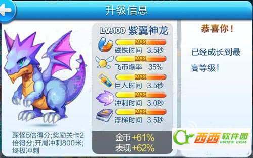 技能:踩怪5倍得分、奖励关卡2倍得分、开局冲刺800米、终极冲刺