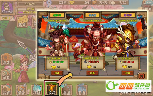 求神将:可招募3-4星武将,免费招募后进入冷却CD(72小时),冷却时间内可使用300元宝继续招募。首次使用元宝进行“求神将”必然获得4星武将。