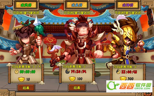 求将:可招募1-3星武将,每天可免费5次。招募后进入10分钟的冷却时间,在冷却时间未结束或免费次数达到上限后均可使用10元宝继续进行招募。