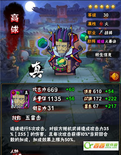 技能:五雷击:连续进行5次攻击,对敌方随机武将造成攻击力35%(255)的伤害,且每次攻击获得10%*当前回复数的加成,加上效果上限为50%