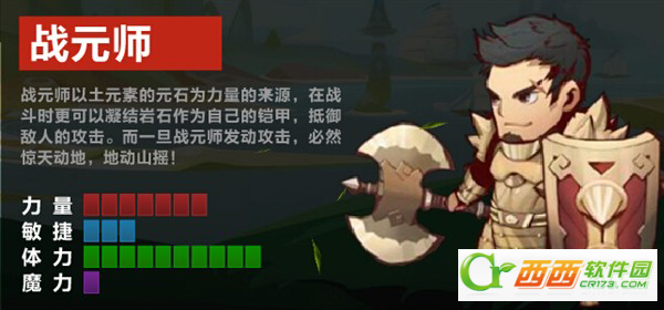 战元师以土元素的元石为力量的来源,在战斗时更可以凝结岩石作为自己的铠甲,抵御敌人的攻击。而一旦战元师发动攻击,必然惊天动地,地动山摇。