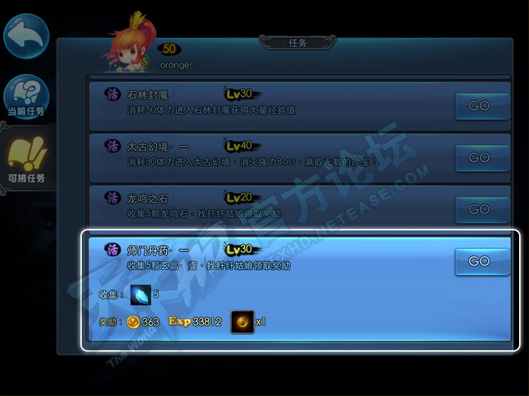 我们到了30级就可以找门派大师姐领取师门丹药的任务了(先完成支线-师门新秀任务),这也是一个收集类的任务,我们需要提交玄晶来完成任务,任务完成后不但可以领取经验奖励,还可以获得一个经验丹哦,使用后又可以获得大量经验了,所以是双重经验啦。但是玄晶可是开孔的材料呢,所以我们在做这个任务的时候可要先看看包中玄晶数量啦。这个任务每天也可以完成多次。