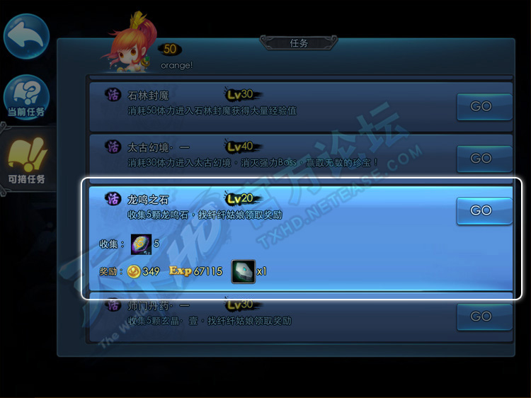 在我们达到20级是就可以领取支线任务-龙门客栈,完成该任务后就开启了“龙鸣之石”任务了,任务都在酒馆老板npc-苏纤纤处领取,任务是需要收集5块龙鸣石,提交后即可获得大量经验还有强化石哦,强化石可以用来加护装备。但是要注意的是锻造装备可是需要用到龙鸣石的,所以在做这个任务的时候可要根据自己材料的情况斟酌一下。