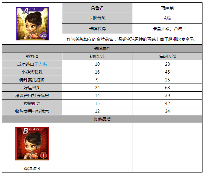 喜欢《天天富翁》的小伙伴们一定对A级卡片荷绾绾很感兴趣吧?作为游戏中既性感又强力的一张卡牌,荷绾绾具体属性到底是怎么样的?天这里小编就为大家带来了她的属性技能列表图,大家可以参考一下。