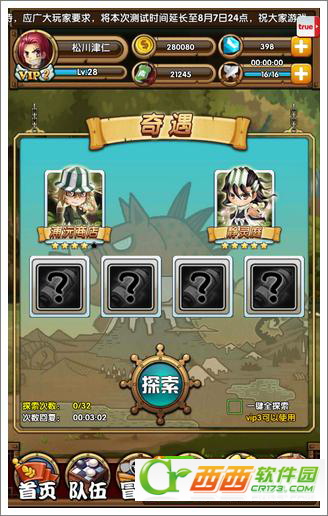 进入奇遇玩法界面中,点击中间探索键即可。默认有32次探索机会,没消耗一次,需要6分钟恢复时间。提升等级的话也可以恢复一定的次数;