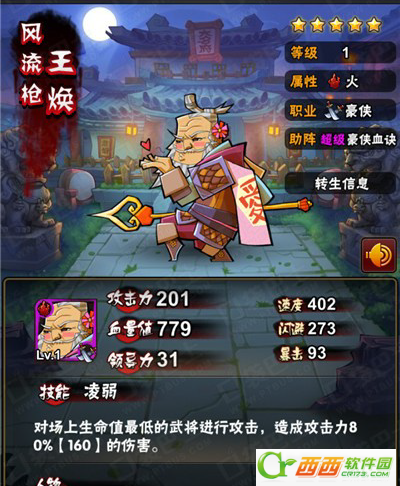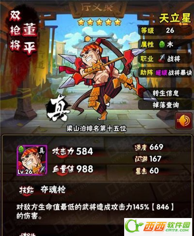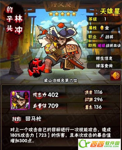 回马枪:回马枪,对上一个攻击自己的目标造成160%攻击力的伤害,本次攻击暴击值增加300点,然后随机对另一敌将进行普通攻击并恢复100怒气。