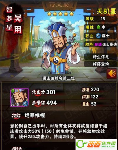 运筹帷幄:当轮到自己出手时,对所有全体友将恢复相当于施法者攻击力50%的生命值,并施放加攻效果,提升25%攻击力,持续2回合。