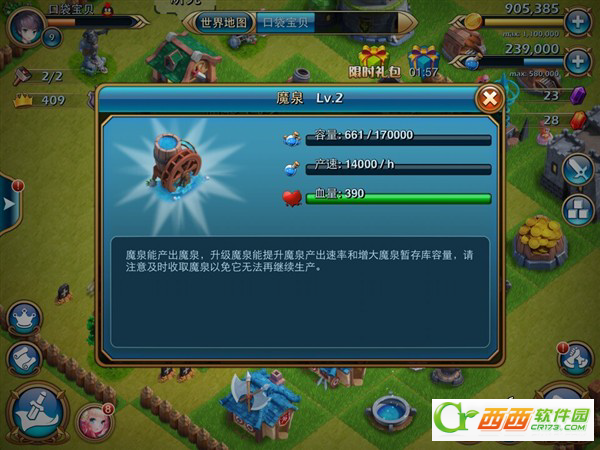 魔泉矿:魔泉矿能产出魔泉,升级魔泉能提升魔泉产出速率和增大魔泉暂存库容量,请注意及时收取魔泉以免它无法再继续生产。兵工厂、阅兵场等建筑物的升级是需要魔泉水才可以的。