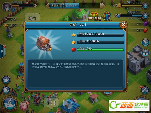 金矿:金矿是自己兴建城市最主要的收入来源之一,升级金矿能提升金币产出速率和增大金币暂存库容量,请注意及时收取金币以免它无法再继续生产。而且主城、外交会议建筑、图书馆等建筑物升级都是需要花费大量的金币的。所以提升金矿的等级是玩家必须注意的重中之重。