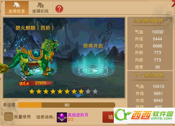 使用进阶丹可对坐骑进行培养,坐骑每满10星则升级为下一阶;