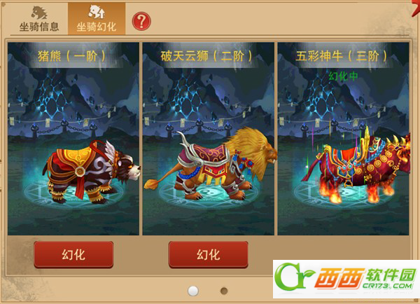 坐骑每一阶对应一个外形,当对应的外形被激活时(坐骑进阶时获得),坐骑下方出现“幻化”按钮,点击幻化坐骑当前坐骑切换为当前形象;