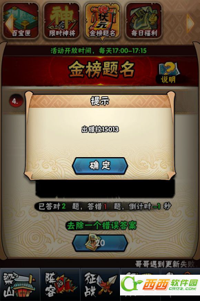 今天又不少玩家在玩《全民水浒》金榜题名答题活动时出现了下面这样的提示:错误15013。这不是坑爹吗?!我才答了两个问题,接着就连接中断了!那么这到底是怎么回事,又该怎么办呢?下面西西来给大家解答一下。