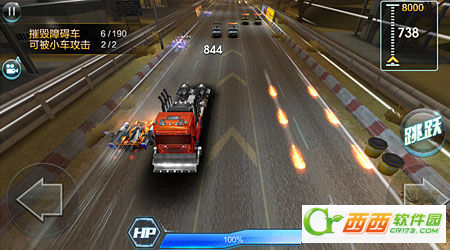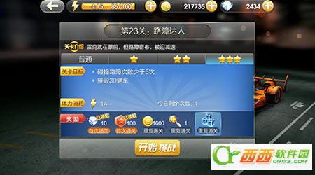 障碍类关卡——在飞驰的赛道之上,一段段的距离布上很多的路障。通常这类的关卡要求就是被障碍阻拦的次数和撞毁车辆的数目。这个其实是考验玩家躲避的技巧。对于有时候会出现一整排的路障,你就要使用跳跃功能。还有超车激发冲来破坏车辆哦!还有要一直保持怒的状态,形成保护膜哦!这样可以防止撞到路障时被阻拦。
