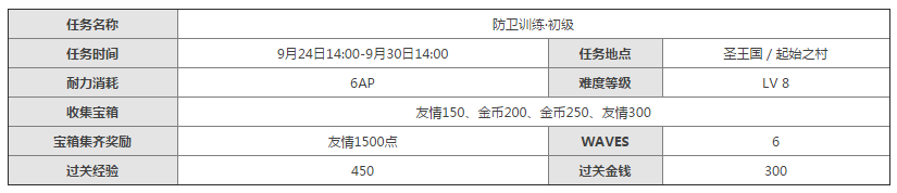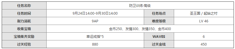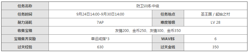 《锁链战记》新一周的成长任务又开启啦!这一次的任务是防卫训练哦!大家在通关中级和高级任务之后,就会获得幸运戒指。如果加还在苦苦积攒戒指的话,那么这次的活动就不要所过了!活动开启的时间是:9月24日下午14:00~9月30日下午14:00。下面让我们一起来看看活动的具体资料吧!
