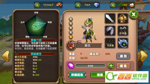 由上面的属性我们可以看出,黄忠是一个强力的物理输出英雄,在游戏中的输出能力可以排在前几位。而且进化到紫色之后,能够增加全体队友的物理攻击,如果你想要培养一个物理阵容,那么就把黄忠培养起来吧!