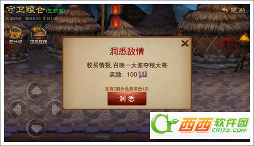 值得注意的是盗粮敌军颇为狡猾,在粮仓场景中有可能同时出现10个夺粮将军,但其中只有一个是真身,其余均为混淆视听的假象,击杀夺粮将军的真身即可获得黄金宝箱。此外,至尊7以上的玩家还可花费一些元宝“洞悉敌情”,收买情报。操作之后界面上将出现一批夺粮将军,并可立即获得一笔声望奖励。如果你的VIP等级达到至尊7,可额外免费洞悉1次。由于击杀每个敌军的战斗是有时间限制的,并且击杀失败时无法复活,因此玩家需争分夺秒速战速决。