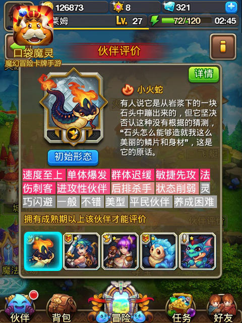 这个新奇的系统每天会挑选出5个魔灵,如果你的小冒险分队里有这个魔灵成员,并且已经培养到了成熟期,就可以为该魔灵进行评价。魔灵可以在评价榜上面直接查看,系统会为魔灵预先准备几个评价,玩家可以选择3个自己认为最符合该魔灵的评价,评价之后即可以获得功勋奖励,这可比一次次闯关可轻松多了。