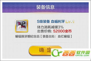 血蝠利牙:体力消耗减缓3%。这个装备和宠物血红蝙蝠的效果是一样的都是减缓体力的消耗。如果你的狐妖集齐了血红蝙蝠和血蝠利牙的话,恭喜你,你就可以跑他个三天两夜了!
