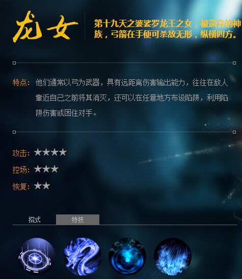 在魔天大圣中每个职业都拥有4个不同的特技,在战斗中,只允许选取其中两个使用,下面来介绍龙女4个特技的特点以及应用。