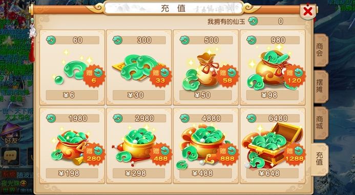 在游戏主界面的左上角有个商城,点击进入商城界面,在商城界面选择充值选项就可以跳转到充值页面。到了这里想必也不用我多说了,没错,仙玉是梦幻西游手游手游的计费方法,想要获得仙玉就得充钱。