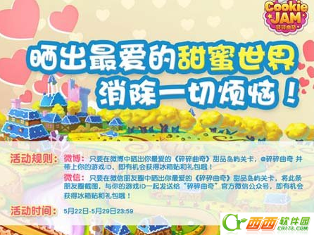 只要在微博中晒出你最爱的《碎碎曲奇》甜品岛屿关卡(可参考截图),@碎碎曲奇 并带上你的游戏gid,即有机会获得冰箱贴和礼包哦!只要在微信朋友圈中晒出你最爱的《碎碎曲奇》甜品岛屿关卡(可参考截图),将此条朋友圈截图,与你的游戏gid一起发送给“碎碎曲奇”微信公众号,即有机会获得冰箱贴和礼包哦!