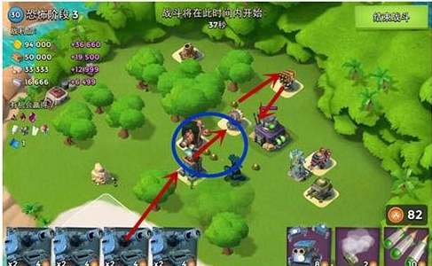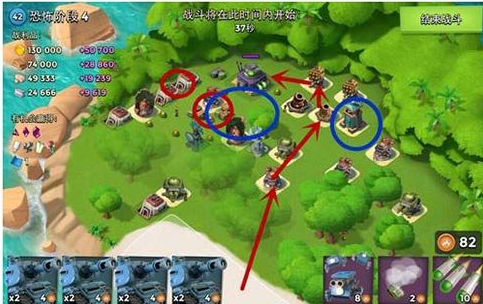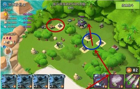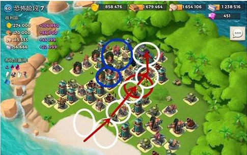 坦克从左侧登陆拆防御建筑收集能量,然后在炸掉红圈内的防御建筑,菊花器一定要拆掉,最后能轻松拿下基地。