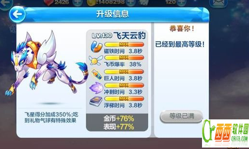 磁铁时间:3.8s、飞币概率:38%、巨人时间:3.8s、冲刺时间:3.3s、浮梯时间:3.8s、金币得分加成:76%、表现得分加成:77%