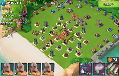图中①处有一排高爆雷,能量不能忽视,所以需要用一两发土豪弹清理掉再进攻。这张图的进攻路线比较短,不用担心用了土豪弹以后不够烟雾弹铺路。