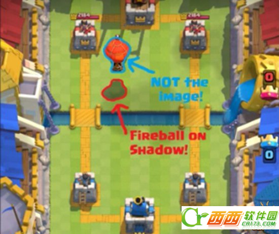 所以让我们来讨论一下火球同时烧一个建筑物和护卫塔是不是好价值操作。这也是很多人面对使用多个建筑物的对手时,头疼的地方。现在,我要告诉你们,如下的火球用法很糟糕: