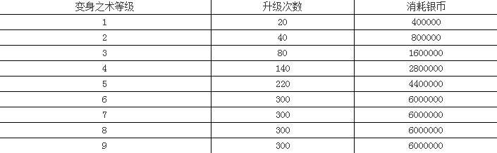 变身卡升一级需要点很多次,一次需要消耗20000银币,直到满级都是一样的。只是等级越高,升级需要点的次数越多,不过6—9次数是一样的,一共需要消耗银币34000000。