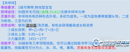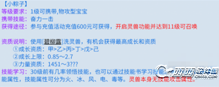由图可见,小粽子资质与以上灵兽相同,成长提高到了0.85-2.7,技能多了一个奋力一击,差别仅此而已。