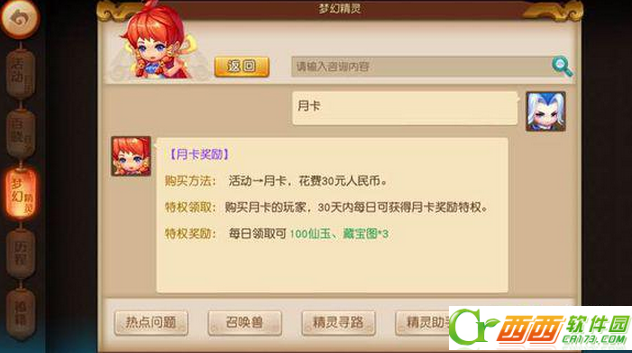 月卡需要花费30元RMB,可以获得的福利是每天领取100仙玉,120体力,藏宝图3张,6次扫荡次数。
