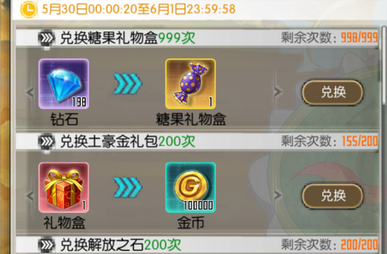 礼物盒可以兑换金币、解放石等等道具,西西还是推荐兑换金币,金币,金币。