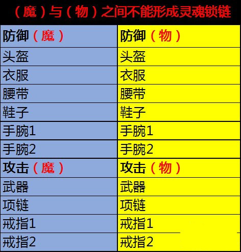 无论是土豪还是小白玩家,无论是5,6,7等材料打造出来的装备,大家都有机会获得一种装备上带有【风】【雨】【雷】【电】【火】,这里只介绍一种比较简单的方法凑灵魂,全身去凑一种灵魂属性,这样容易激活属性,可以跨等级激活,但是不能跨属性,例如魔法攻击的武器不能和物理攻击的戒指凑灵魂,如下表,颜色相同才能成为灵魂套。