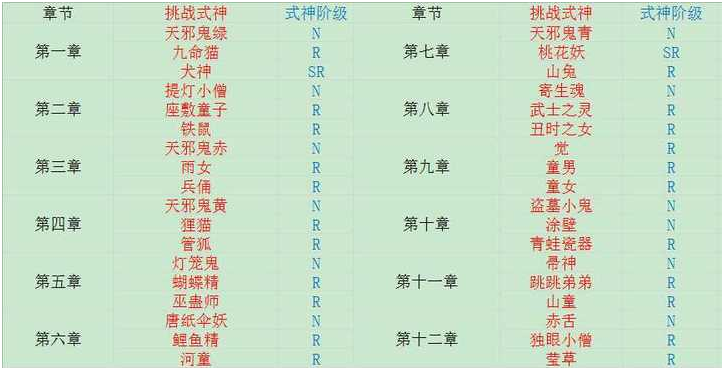 阴阳师手游每完成一章节主线后,便可以探索,探索完成后有几率发现本章节的式神挑战。挑战式神可以获得相应的式神碎片哦。下面西西就来为大家分享阴阳师手游各章节挑战式神列表,希望大家喜欢。