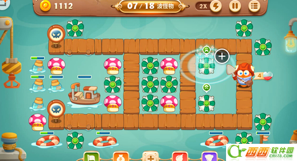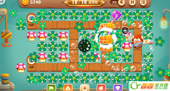 2、熬过前面几波后,就可以对外发展了。建塔时蘑菇塔优先,上下对称。蘑菇塔可以使怪物表小,减缓怪物行进速度,对我们非常有用。