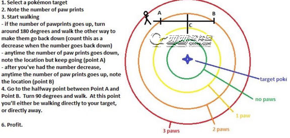 这招简称两点法。找到任意两处三爪变二爪(或二爪变三爪)的变换点,连接两点后沿中垂线走就能找到目标精灵。简单吧?
