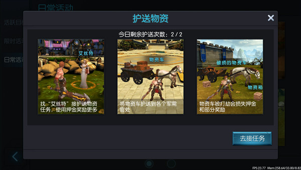 2、护送物资在阵营护送是简单有额外的经验加成,马车如果不是橙色,用钻石刷出橙色,能增加不少经验,最低也要保证是紫色马车,花点钻石不要心疼;运输前记得投保,也有经验加成。