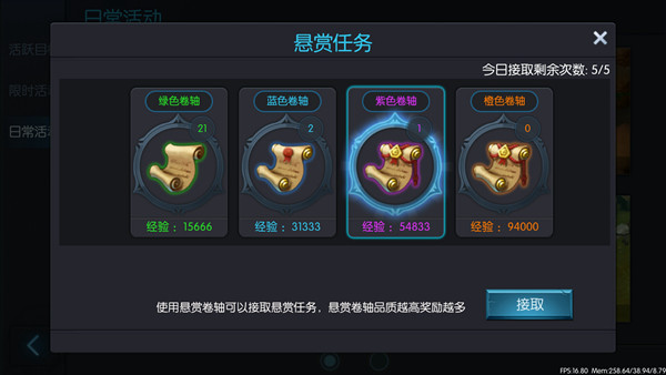 5、悬赏任务每天放在后面才做,因为游戏活动可以获取悬赏卷轴,我们每天要做的是保证在有5个卷轴可用的情况下把多余的卷轴尽可能的合成高级,等其它活动都做完再根据一天获得的悬赏卷轴数量进行合成,这样能获取更多经验。