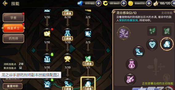 这套技能搭配主要选取了炼金术士毒系技能及药剂师新增的输出技能,通过药剂师的强化这套技能能够打出高额的伤害。混合感染的选择主要是因为混合感染拥有超高的输出能力,同时还能使敌人受到的伤害加深,再次提升了药剂师的输出能力,保证她在副本中的输出地位。