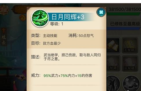 武当绝学,损己伤敌,取与敌人同归于尽之意,作用目标敌方血量最少侠客,造成95%武力+75%内力+一定的技能等级伤害。同时减少自身当前8%的气血,根据自己减少的气血对敌人造成双倍伤害,当敌方血量少于30%时触发致命一击效果。
