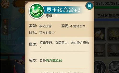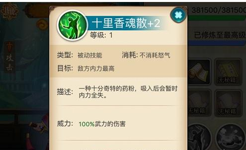 作用目标敌方内力最高,可为自身增加一定的武力属性,同时普攻有65%机率触发内伤,使敌方内力全失,持续2回合。此技能虽无致命一击效果那般霸道,但65%机率触发内伤的作用,依旧不容小觑,不仅具有一定机率控制敌方内力型攻击侠客输出能力,如果命中了敌方治疗侠客,更能起到逆转战局的作用。
