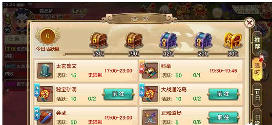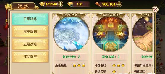 在日常试炼玩法中,玩家可以挑战多种试炼副本,每种副本都有着自己独特的奖励,如修炼之地可以为玩家提供大量经验;秘宝矿洞中玩家可以获得大量宝石素材及生产材料;守卫摩云顶则可以产出大量的武功及气功道具。不同试炼的开启时间有所不同。参加试炼需要消耗一定的体力,在体力有限的情况下,要优先选择自己最需要的试炼参加哦